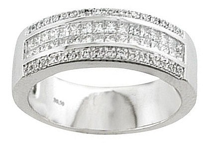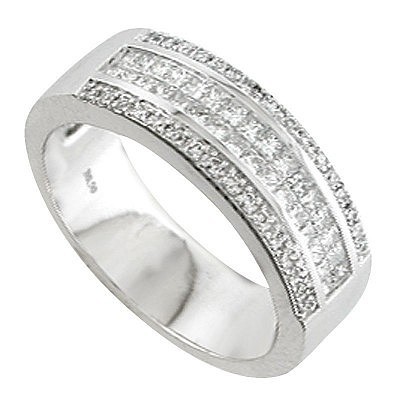 Alliance joaillerie diamants princesse or blanc 18 carats. Cette demi alliance joaillerie diamants princesse est massive. Le centre de l'alliance est composé de deux rangées de diamants princesse, en serti invisible. Les deux rangées extérieures sont composées de diamants taille brillant en serti grain.
