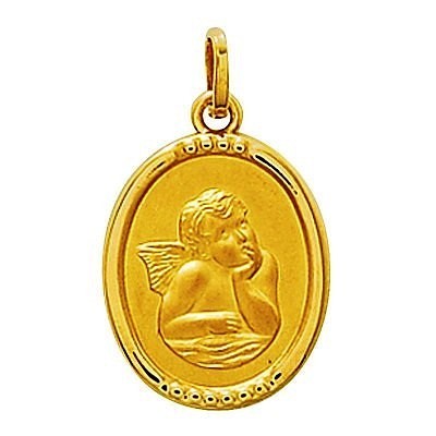 Médaille massive or jaune 18 carats. Cette médaille ovale, qui représente l'ange de Raphaël a une finition satinée. Le bord est en relief, poli brillant et laisse apparaitre un feston haut et bas.