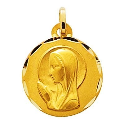 Médaille Vierge massive or jaune 18 carats. Cette médaille ronde, qui représente une vierge auréolée de profil aux mains jointes à une finition satinée mate. Le contour ciselé est brillant.