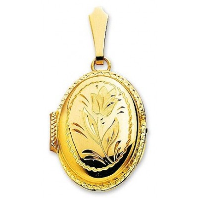 Pendentif porte-photos or jaune 18 carats, tout or. Cassolette ouvrant ovale avec gravure "tulipe" sur la face avant. Système charnière.