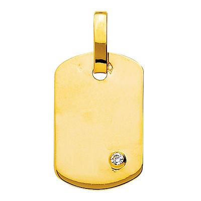 Pendentif Plaque massive or jaune 18 carats rectangulaire de 24 mm x 15 mm, Le haut et le bas de la plaque sont légèrement arrondis. Un diamant de 0,05 carats en serti clos donne de l'éclat à cette plaque or jaune.